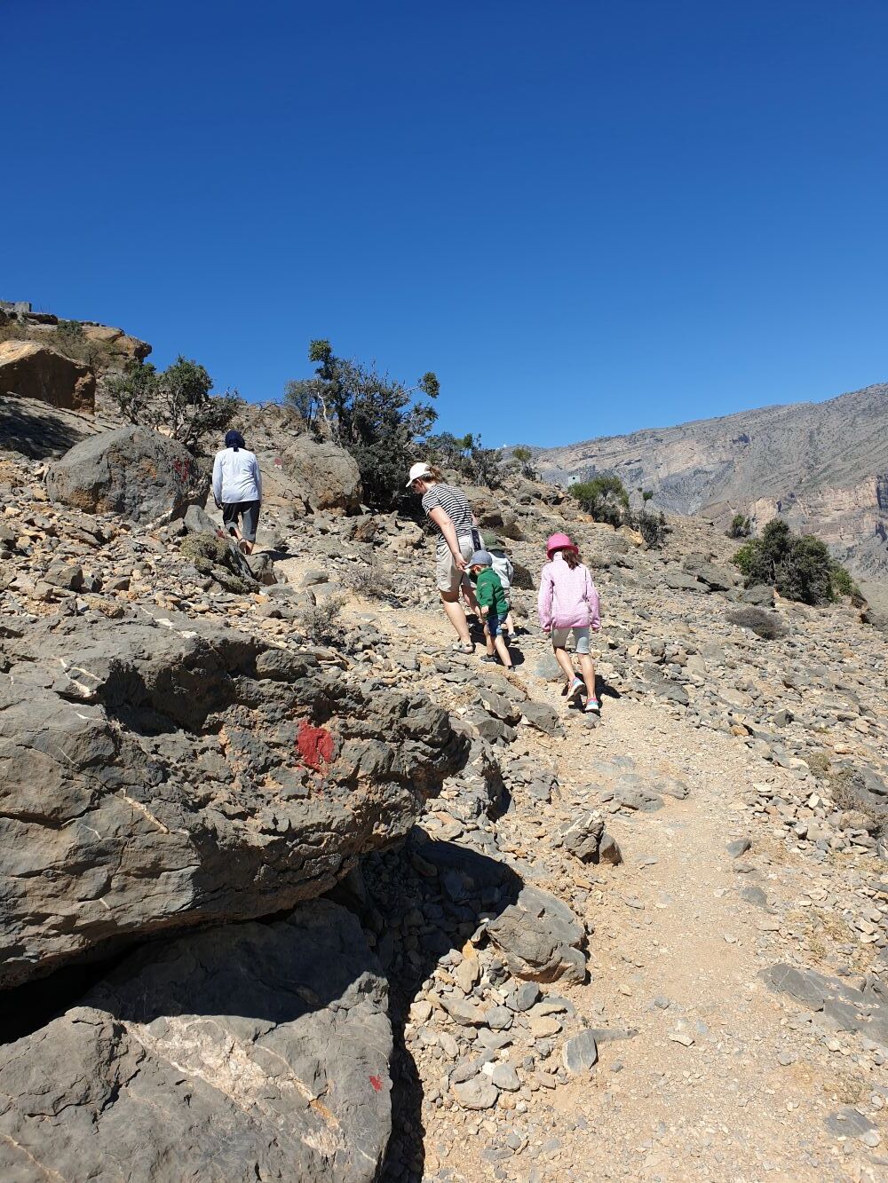 Je höher wir ins Hadschar-Gebirge hinauffuhren, desto spektakulärer wurde die Landschaft. Am Jebel Shams standen wir schließlich am Rand des „Grand Canyon“ des Omans und blickten in eine gewaltige Schlucht, die uns verstummen ließ. Unsere Wanderung entlang der Felskanten war ein echtes Familienabenteuer – mit ausreichend Pausen, staunenden Blicken und dem Gefühl, gemeinsam etwas Besonderes zu erleben.